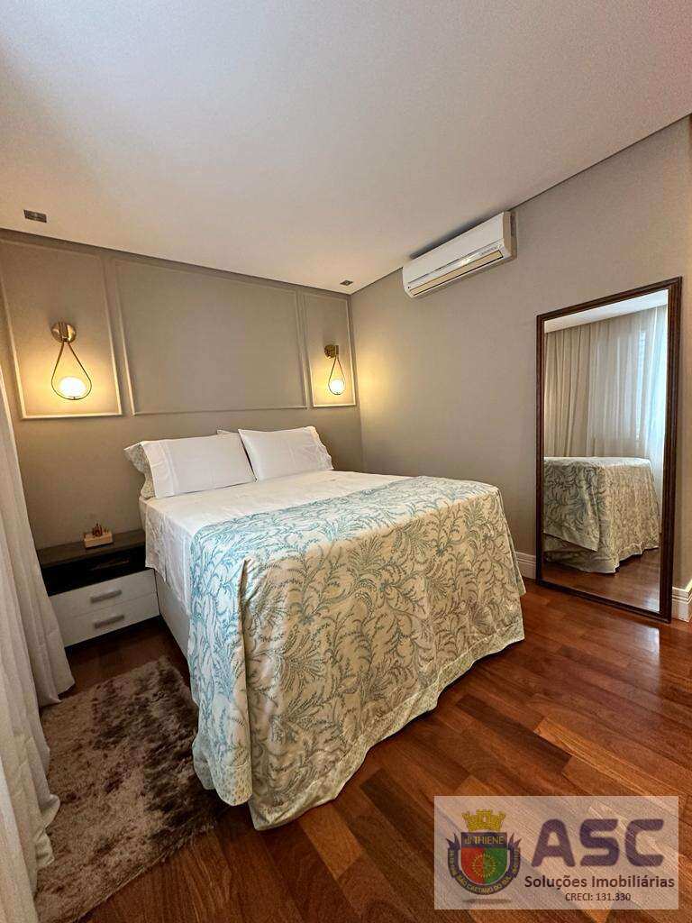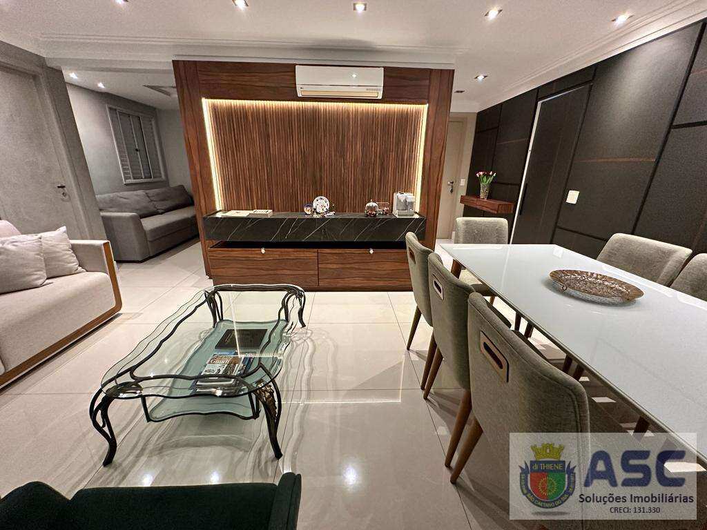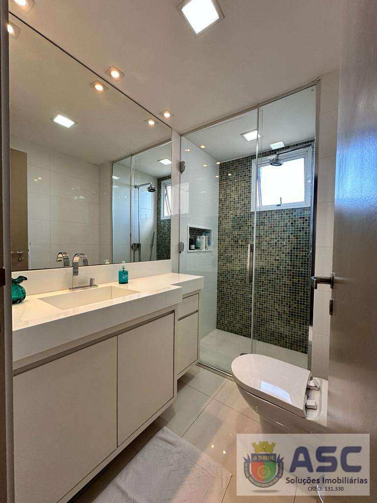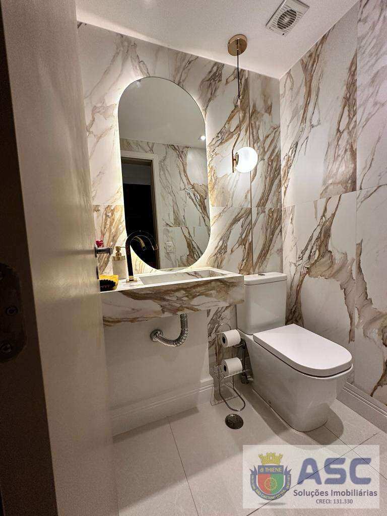Apartamento com 113m² privativos, três dormitórios sendo uma suíte, lavabo, terraço gourmet com fechamento em vidro e churrasqueira, ar condicionado, cozinha ampla no conceito copa, área de serviço individualizada com banheiro de serviço / despensa e duas vagas de garagem cobertas determinadas.