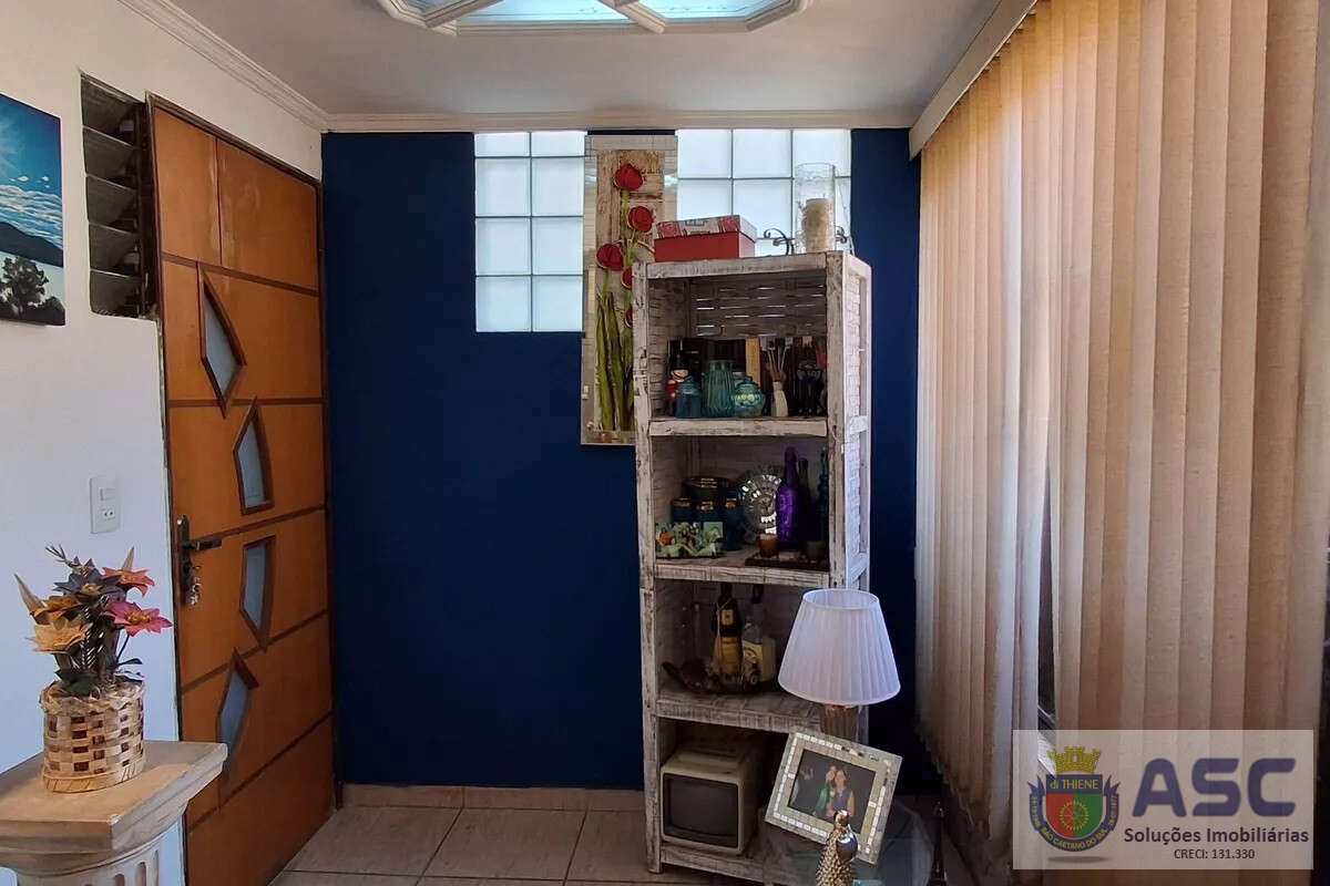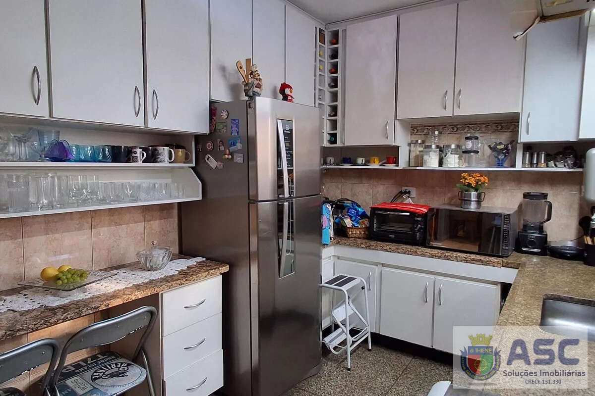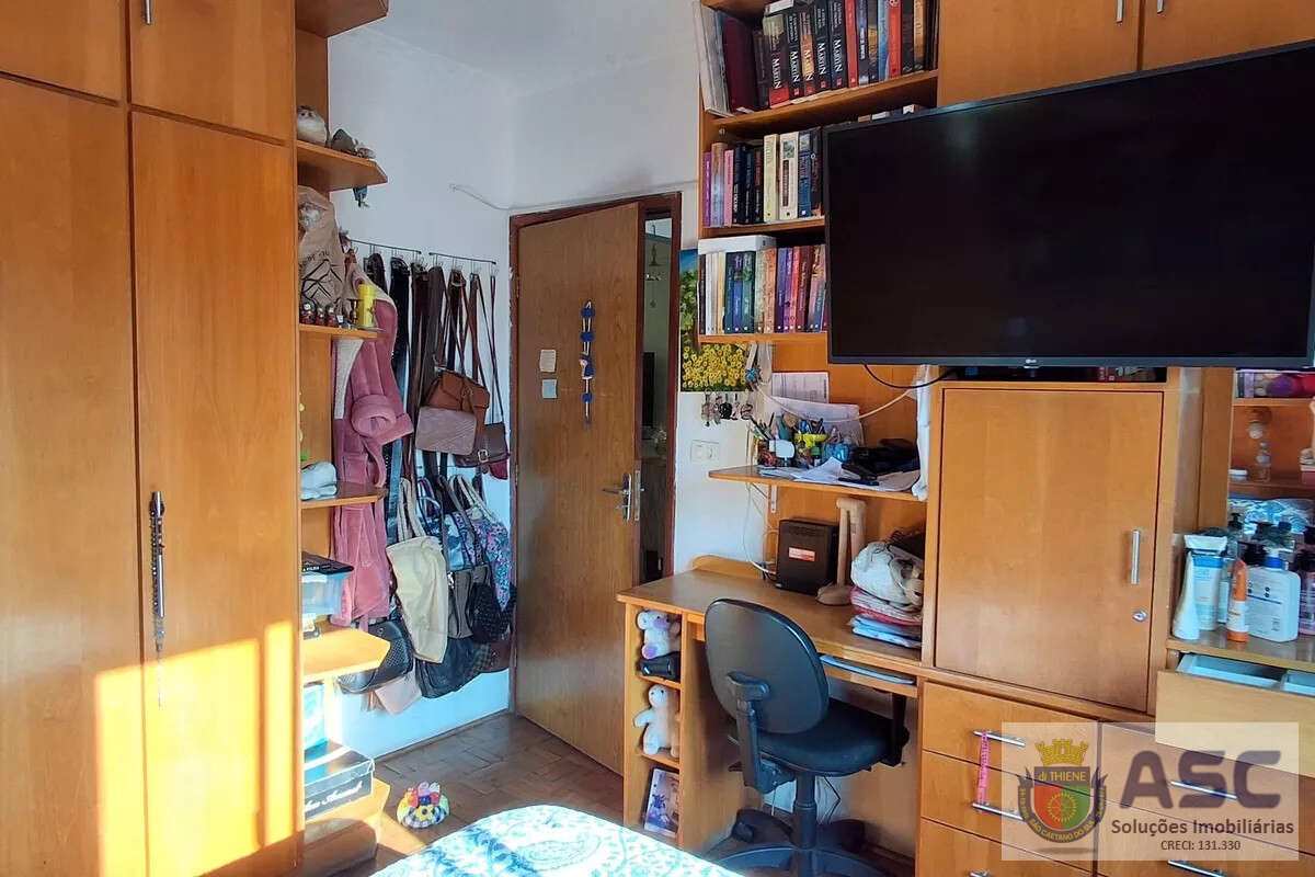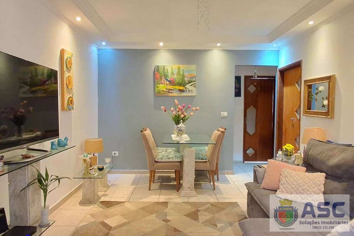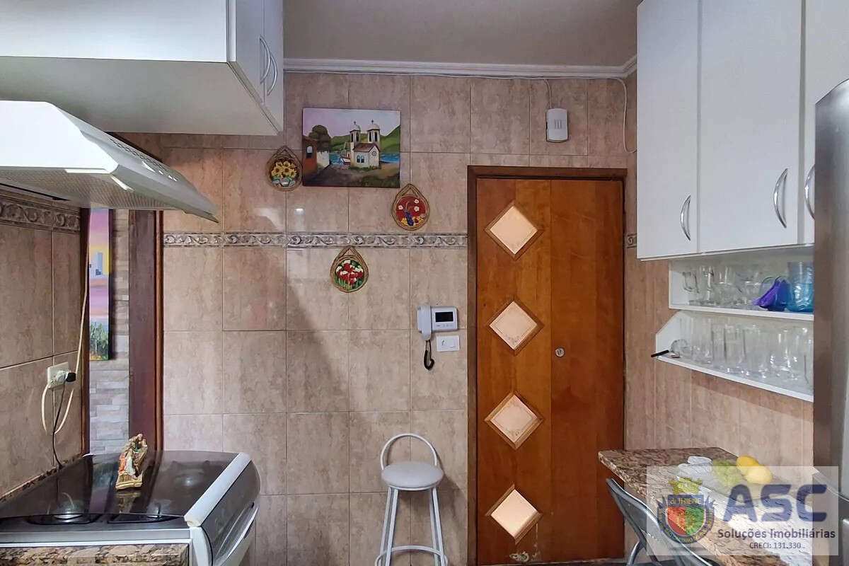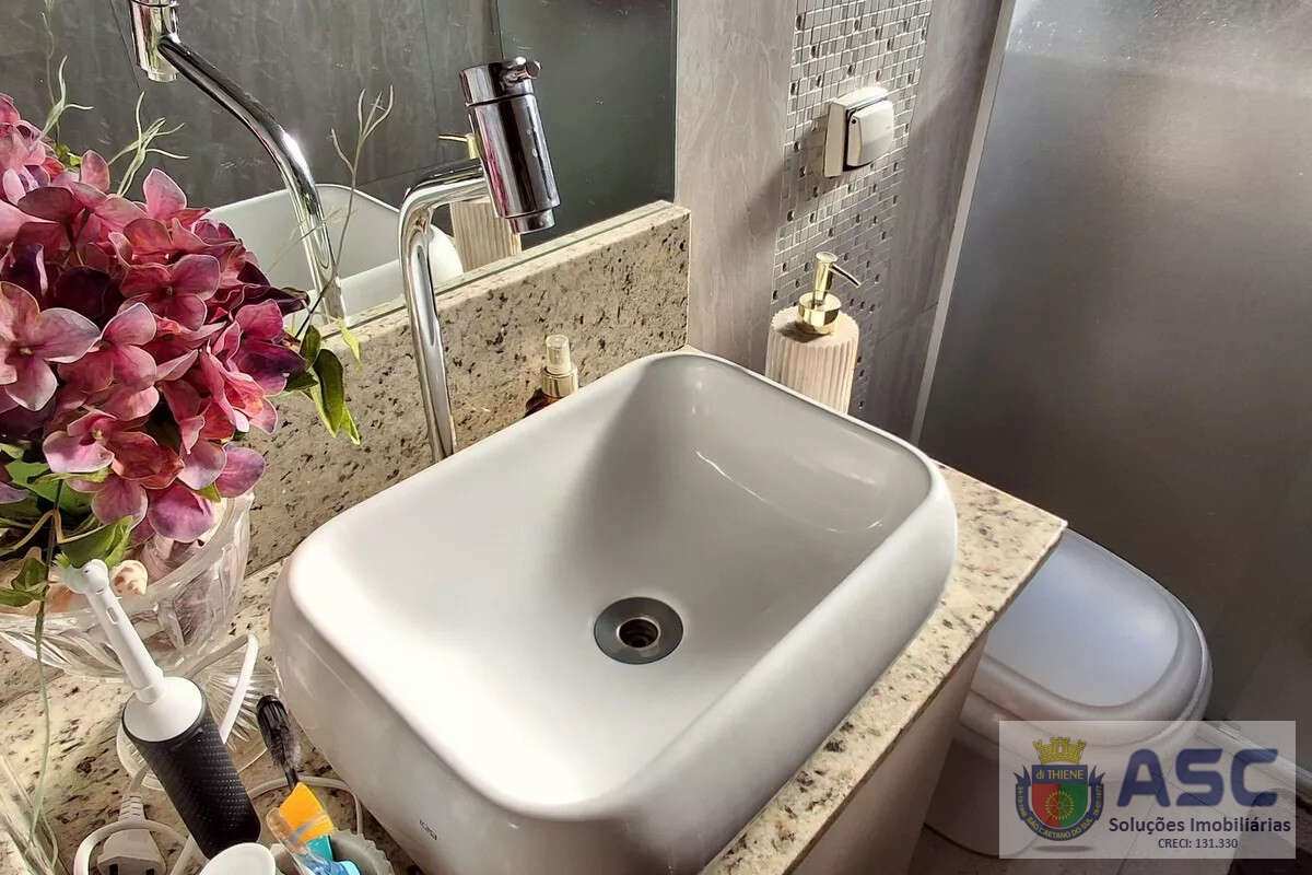 Apartamento com 83m², dois dormitórios, ar condicionado, banheiro social com janela, cozinha ampla, área de serviço externa com banheiro, quintal e duas vagas de garagem.