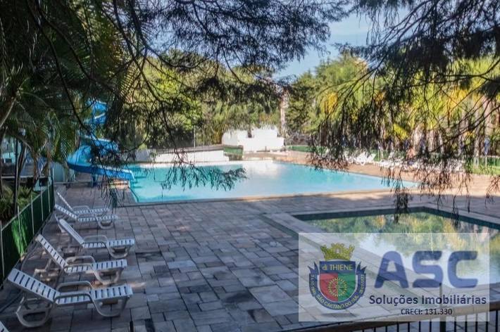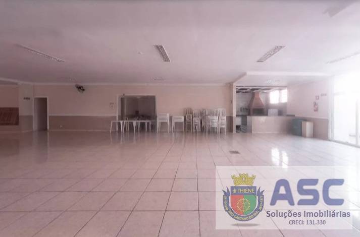 Lazer externo com piscina, salão de festas, churrasqueira, quadra e playground.