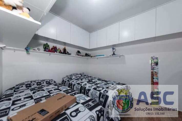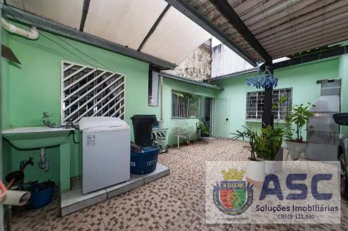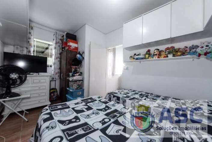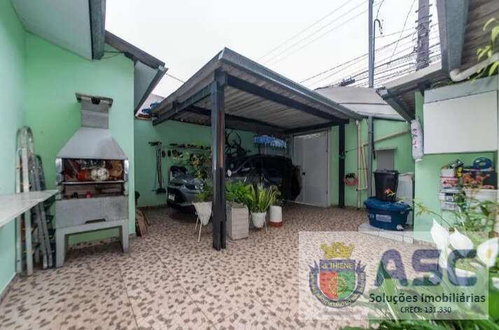 Casa térrea com 58m², dois dormitórios, cozinha ampla, área de serviço externa, quintal com churrasqueira e duas vagas de garagem.