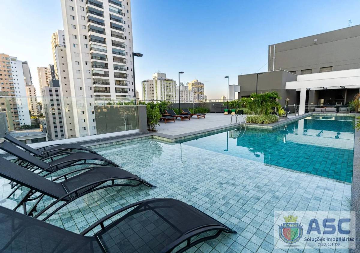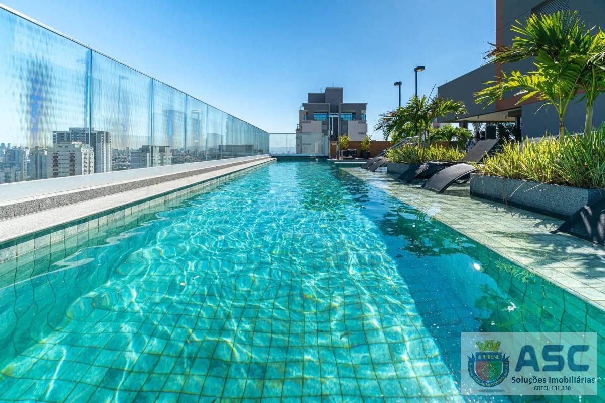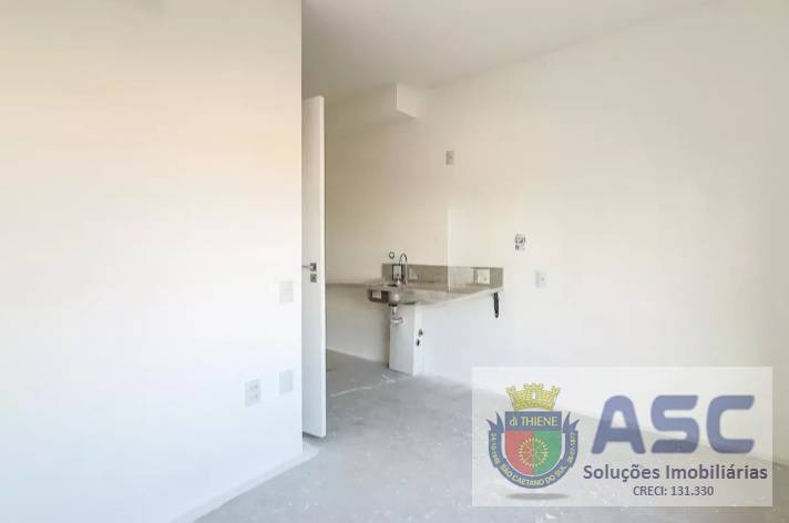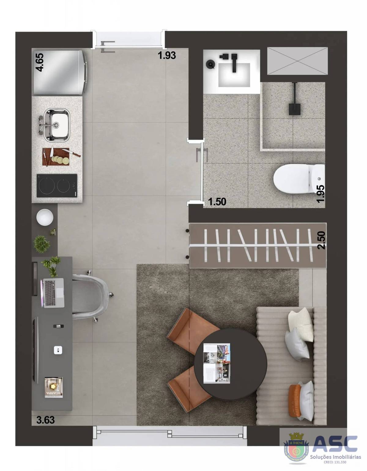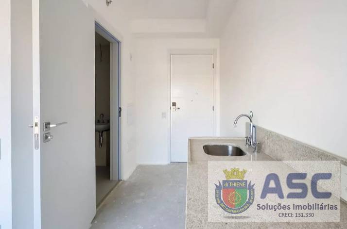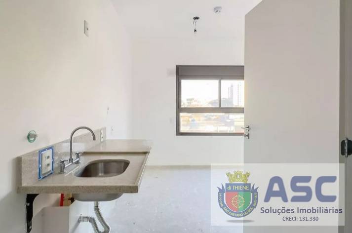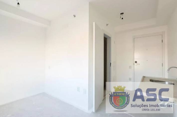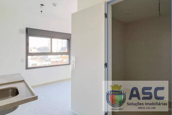 Studio com 20m², banheiro social, persiana de enrolar blackout e misturador de água quente nas torneiras.